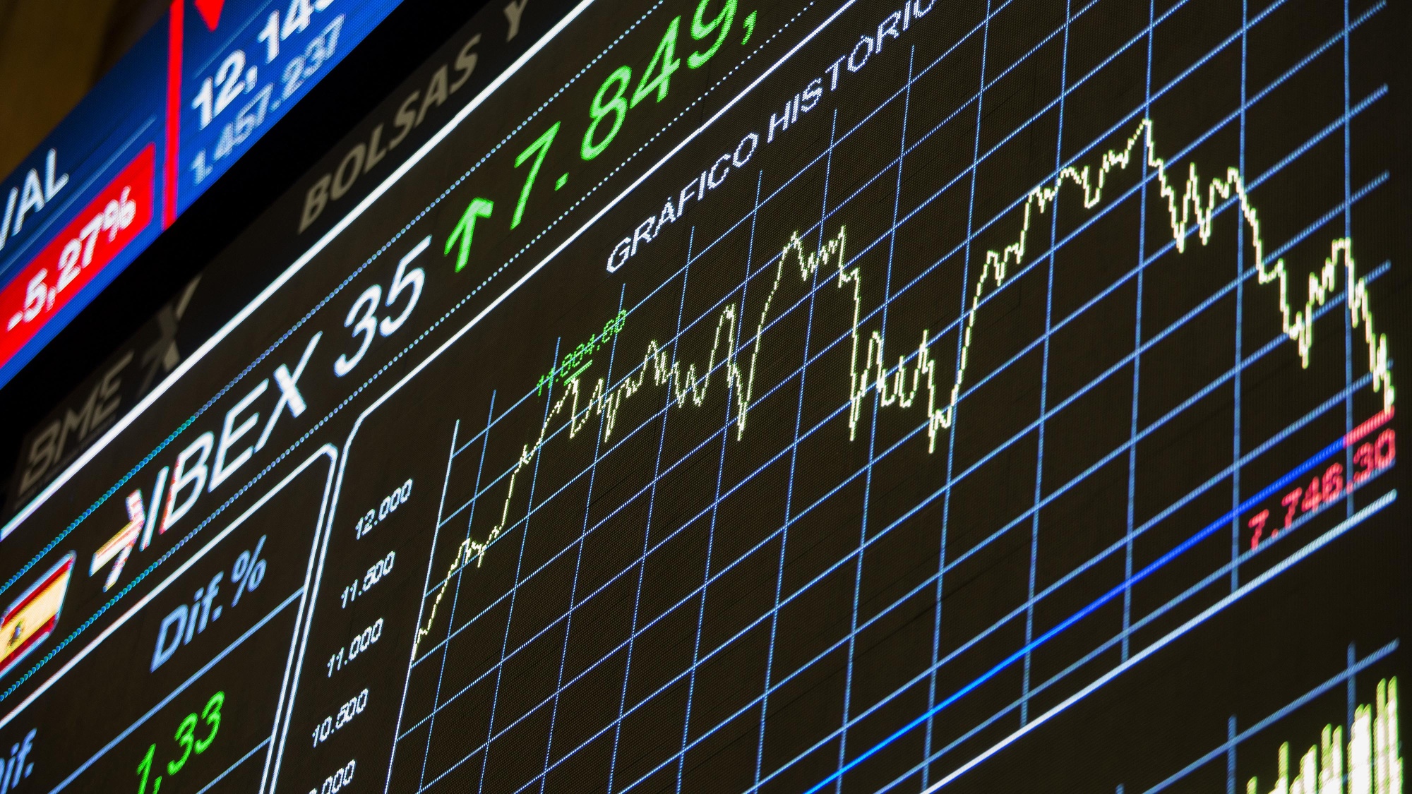 An electronic chart shows the performance of the Ibex 35 index during the last twelve months at the Madrid stock exchange, also known as Bolsas y Mercados Espanoles, in Madrid, Spain, on Friday, Feb. 12, 2016. A rebound in banks helped lift European stocks from their lowest levels since 2013, trimming a second weekly decline. Photographer: Antonio Heredia/Bloomberg via Getty Images