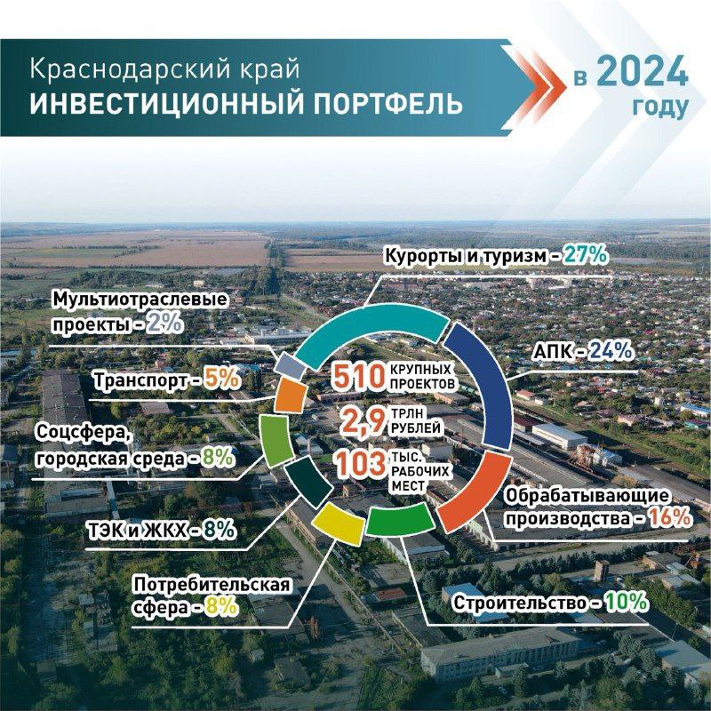 Краснодарский край на протяжении многих лет стабильно удерживает инвестиционное первенство в Южном федеральном округе. На Кубани реализуется 50% из общего числа проектов, в них инвесторы вкладывают 40% средств от общего объема в ЮФО.