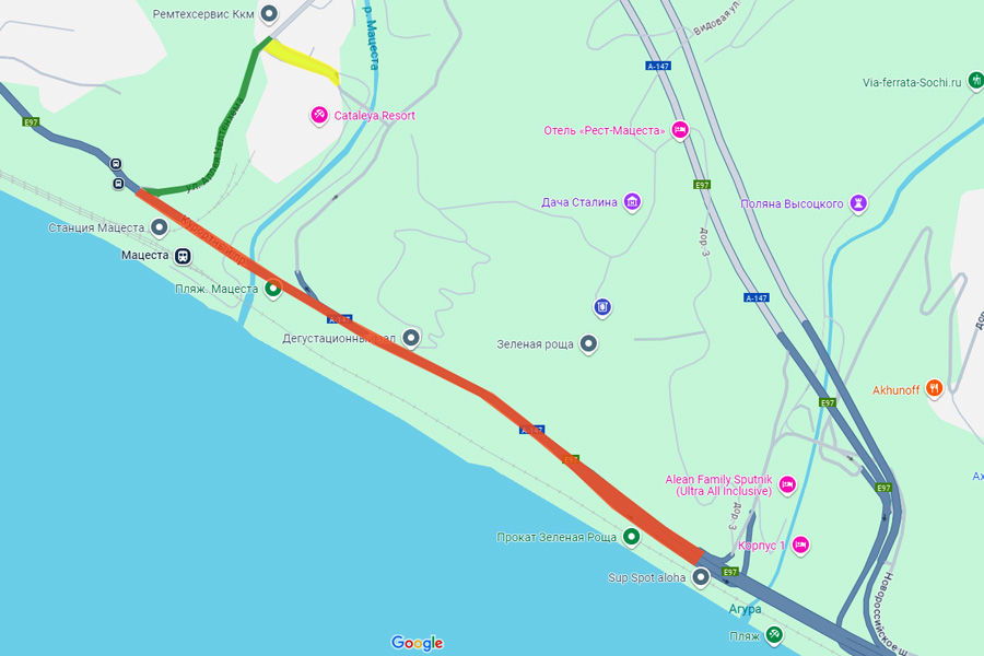 1 (зеленый цвет на схеме): На автодороге «Сочи — Хоста» на отрезке от пересечения с Аллеей Челтенхема до съезда на Новороссийское шоссе отныне станет две полосы движения в сторону Центрального района Сочи и одна полоса — в сторону Адлера.