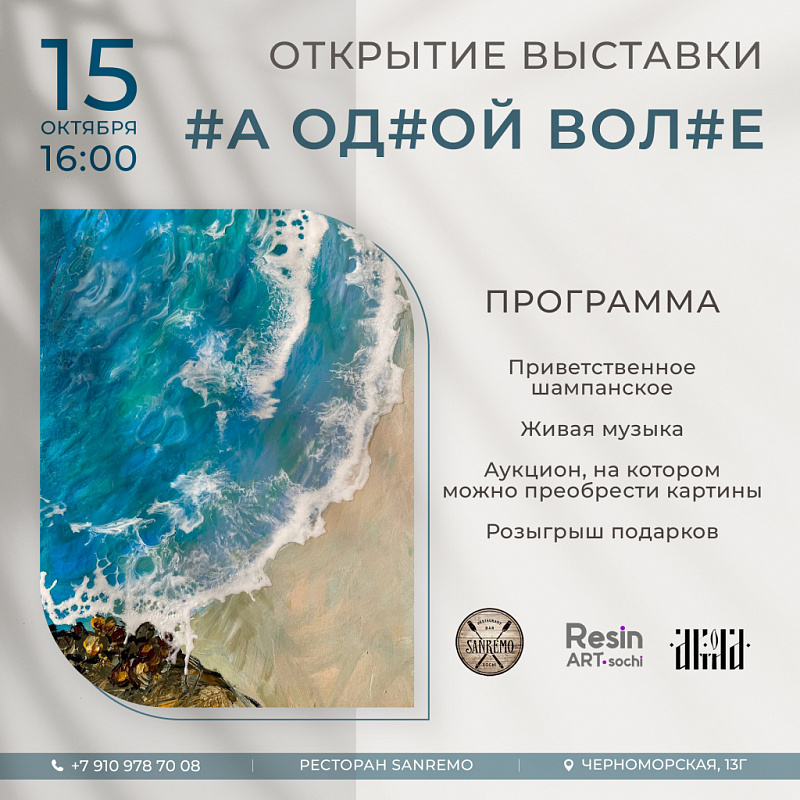 15 октября 2023 года в 16-00 в панорамном зале ресторана SANREMO с потрясающим видом на море состоится торжественное открытие выставки Симоновой Ольги и Татьяны Шулаевой «#А ОД#ОЙ ВОЛ#Е».