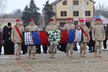 В память, о героизме и мужестве солдат на мемориальном комплексе станицы Динской состоялась торжественная церемонию возложения венков и цветов,