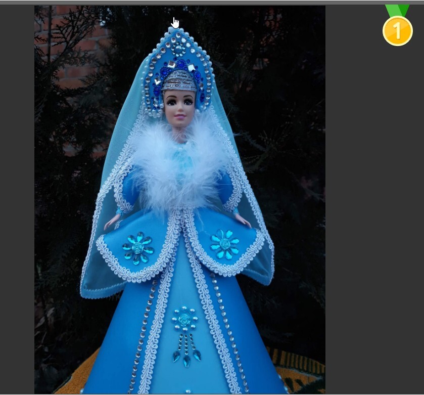 Народное голосование, как и в прошлые годы, происходило в декабре в группе в соцсети «Одноклассники». Победителем же стала мастерица из ст. Старолеушковской Лариса Константиновна Наумик с нарядом для Снегурочки (на фото внизу). Её же работы в виде кроликов из фоамирана и ёлки из конфет заняли 2-е и 3-е места.