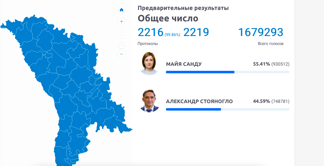 Стояногло уже признал поражение и поблагодарил своих сторонников за поддержку. При этом Санду набрала только 48,81% голосов тех, кто пришёл на избирательные участки в Молдове, а Стояногло набрал 51,19%. В Гагаузии, автономии в составе республики, победу одержал Стояногло (гагауз по национальности), набравший 97% голосов. Жители Приднестровья также отдали ему почти 80% голосов. Победить с существенным перевесом Санду смогла благодаря голосам многочисленной диаспоры за рубежом.