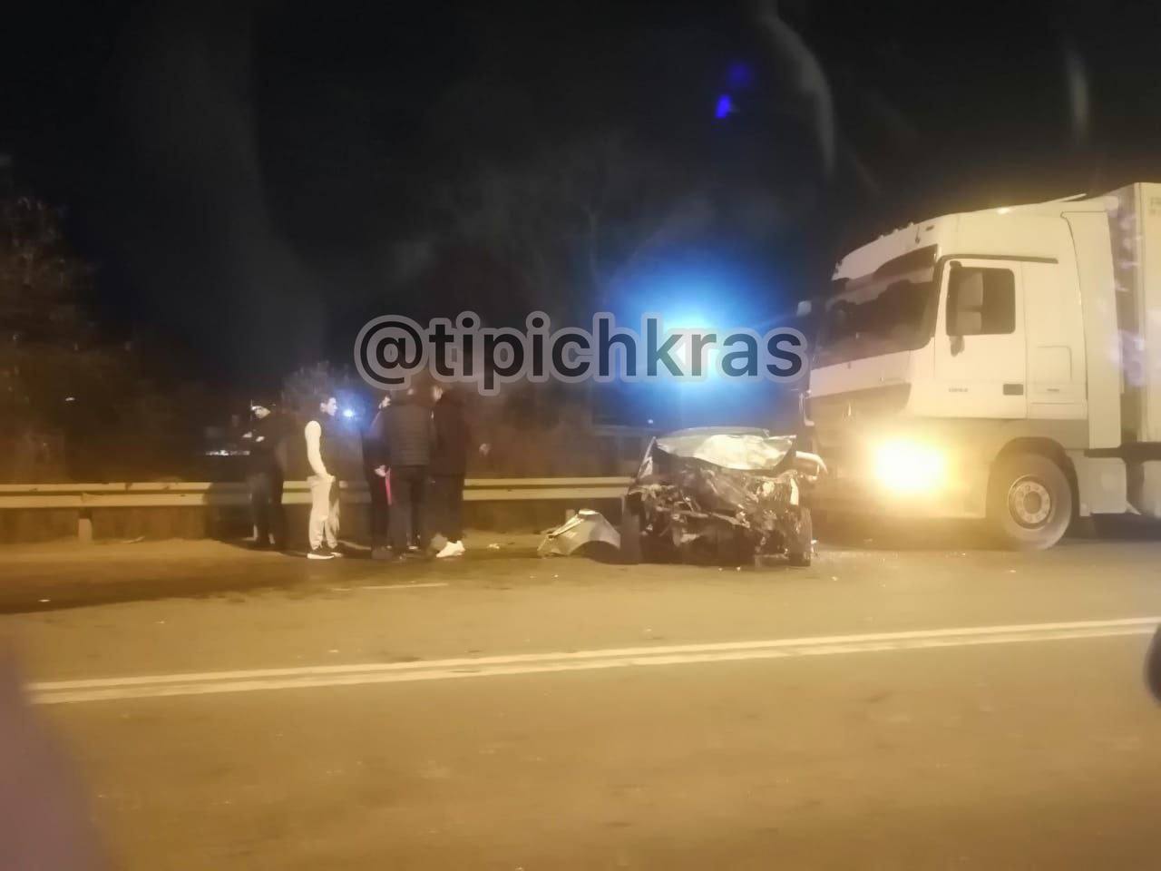Авария произошла на Ростовском шоссе Фото: t.me/tipichkras В ночь на четверг, 2 марта, в Краснодаре фура врезалась в ВАЗ, в аварии есть пострадавшие.