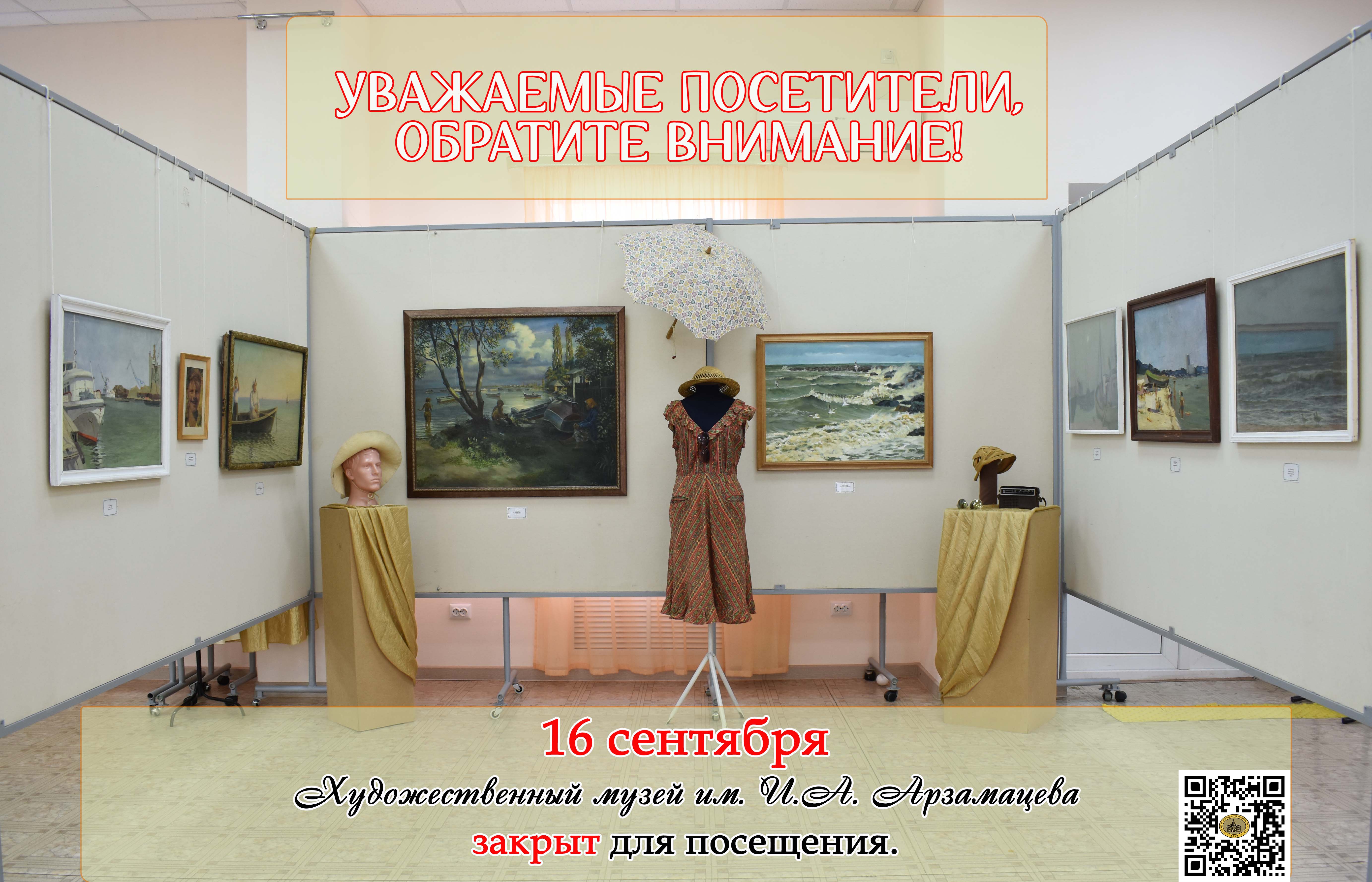 16 сентября Художественный музей им. И.А. Арзамасцева по техническим причинам будет закрыт для посещения. Музей истории города Ейска и Мемориальный музей И.М. Поддубного работают в обычном режиме. Приносим извинения за временные неудобства.