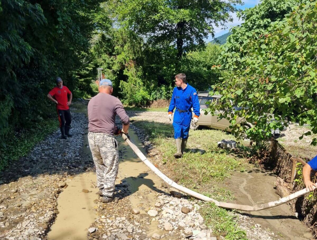 Прибыв в село Горское, группа приступила к расчистке дворов местных жителей от упавших деревьев, веток и мусора, принесенных селевым потоком, откачке воды из колодцев.