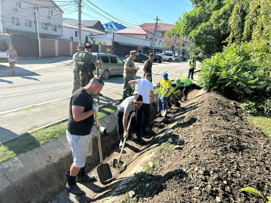 «В поселке Лермонтово работают две бригады из Геленджика. В порядок приведены: насосная станция, которая снабжает поселок водой, а также 150 метров ливневой канализации - они очищены от мусора и ила.