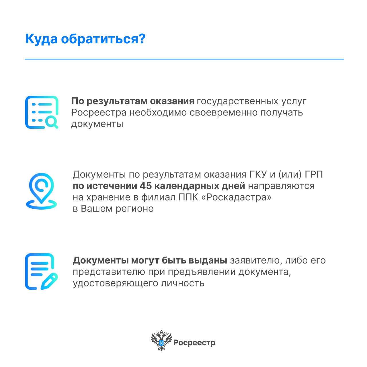 Получив государственную услугу, заявители не всегда забирают документы вовремя. Однако не стоит переживать, если они вдруг понадобятся, все неполученные заявителями документы хранятся в архивах Росреестра и забрать их не составит труда. Как это сделать, читайте в карточках.
