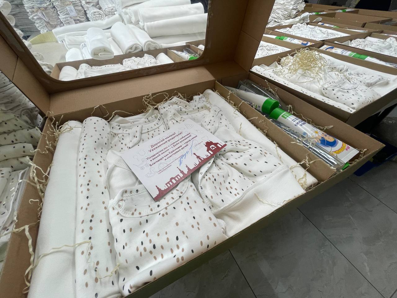 — Благодаря общественной организации «Союз многодетных семей «Кубанская семья» и четырем городским предприятиям смогли воплотить эту идею в жизнь. Подарок полностью произведен в Краснодаре — от упаковки до каждого предмета в ней. Таким образом, мы поддерживаем не только родителей, но и местных производителей, — подчеркнул Евгений Наумов в своём Телеграм-канале .