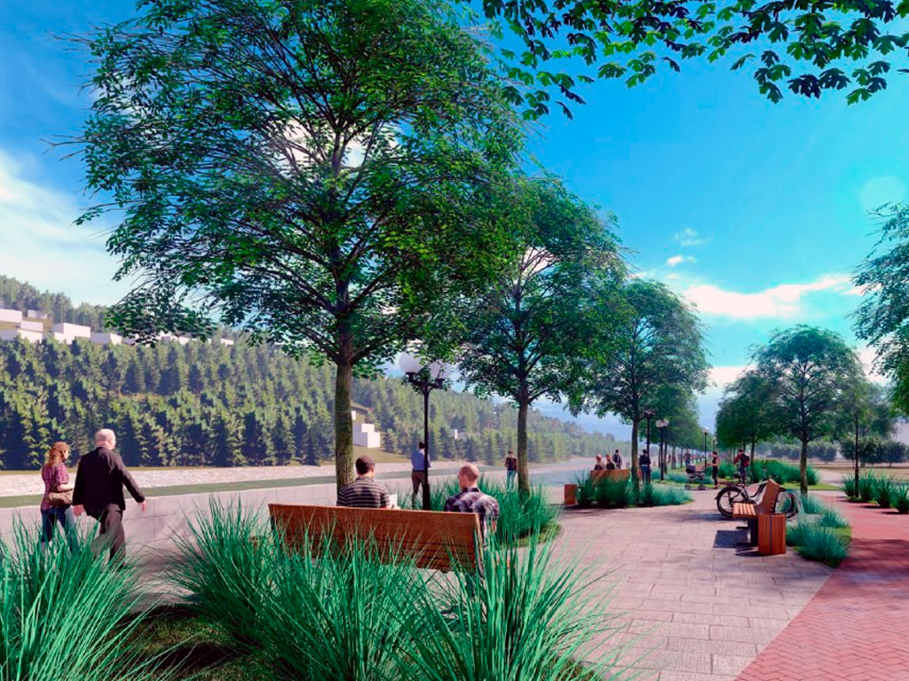 Работы ведутся на правом берегу реки, на участке протяженностью более 1470 метров. Планируется размещение зон отдыха, двух детских и двух спортивных площадок, порядка 180 объектов парковой мебели, обустройство велодорожки и двух парковок. На территории уложат новую плитку, реконструируют парапеты, создадут новые зеленые зоны.