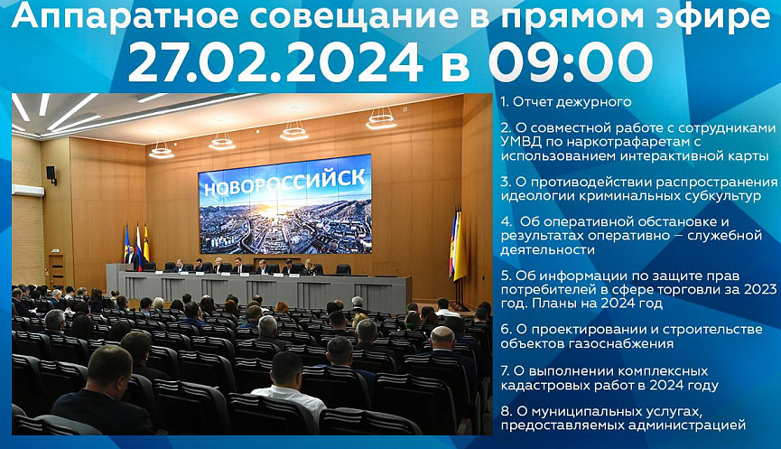 27 февраля в администрации муниципального образования город Новороссийск в 09:00 начнется онлайн-трансляция очередного аппаратного совещания.