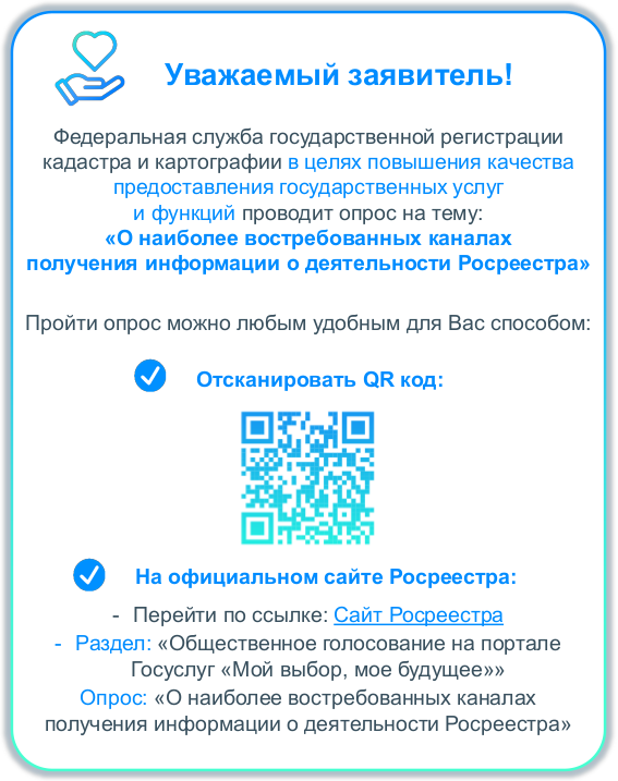 Опрос размещен на главной странице официального сайта Росреестра в информационно-телекоммуникационной сети Интернет в разделе «Общественное голосование на портале Госуслуг «Мой выбор, мое будущее»», опрос: «Оценка удовлетворенности внешних клиентов доступом к информации о деятельности ведомства». К опросу также можно перейти по QR – коду (прилагается) или по ссылке: Опрос о наиболее востребованных каналах получения информации о деятельности Росреестра . Платформа обратной связи на портале Госуслуг, предназначена для быстрого решения актуальных проблем граждан и получение объективной информации об их проблемах.