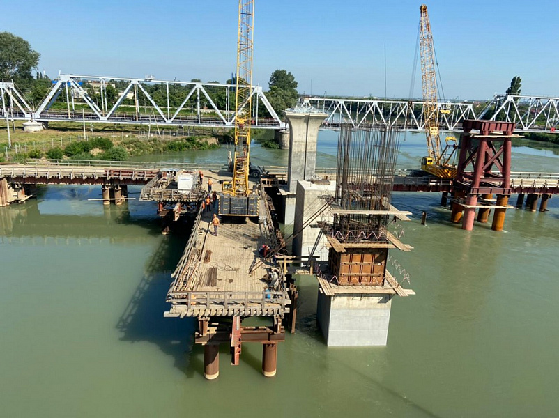 Фото: пресс-служба администрации Краснодарского краяНа начало текущего года удалось завершить устройство всех опор моста, подпорных стен на левом берегу, переустройство газопровода и сети водоснабжения.