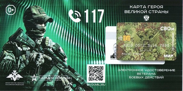 Электронное удостоверение ветерана боевых действий "СВО" в виде пластиковой карты представляет собой единый носитель информации, объединяющий в себе функции удостоверения ветерана боевых действий,