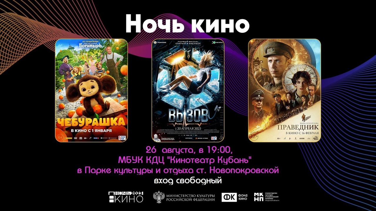 Приглашаем всех посетить Всероссийскую акцию "НОЧЬ КИНО" которая состоится 26 августа 2023 года в 19:00ч. в парке культуры и отдыха станицы Новопокровской.