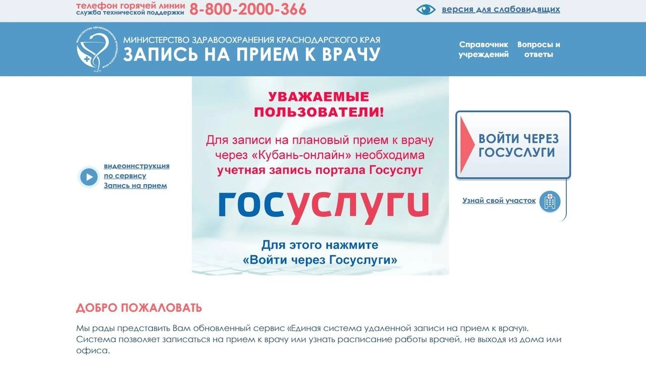 Региональный портал «Кубань-онлайн» снова доступен для записи на прием к врачу