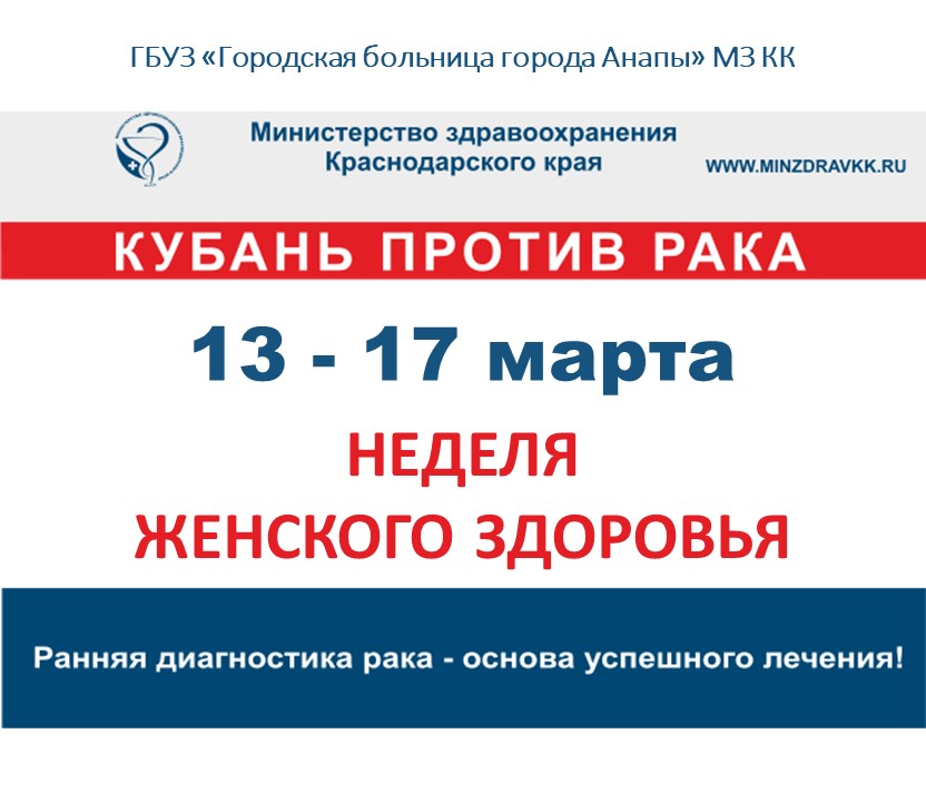С 13 по 17 марта на Кубани пройдет акция «Неделя женского здоровья». Для участия в акции приглашаются женщины старше 55 лет, не посещавшие лечебные учреждения более 2-х лет.